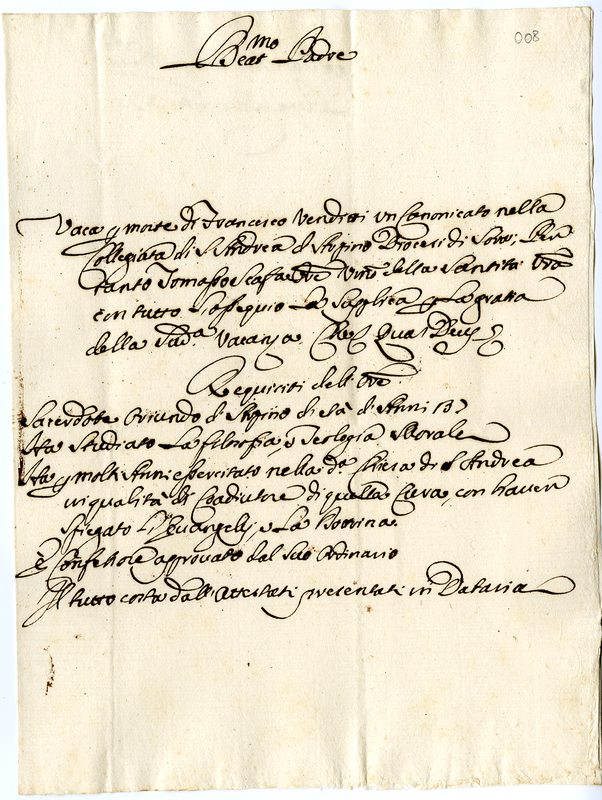 Il sacerdote di Arpino Tommaso Scafa chiede a papa Clemente XI il canonicato della Collegiata di S. Andrea.
