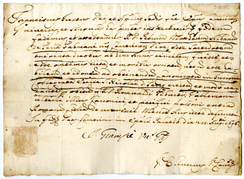Attestato di Francesco vescovo di Camerino a favore di don Pietro Matteo Albani (1696 agosto 28)