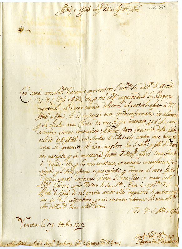 Gregorio, vescovo di Scardona, chiede a monsignor Barbarigo di essere trasferito alla vacante chiesa di Traù.