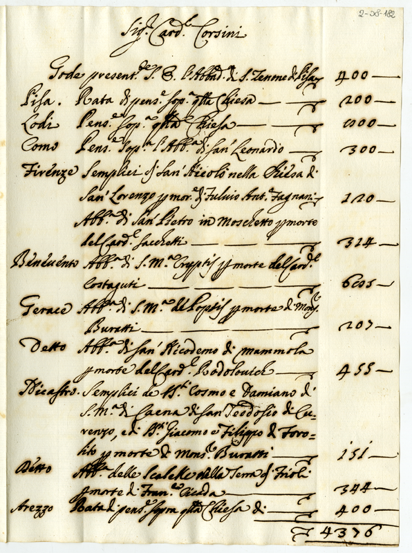 Benefici e pensioni riservate al cardinale Corsini in varie località (1706)