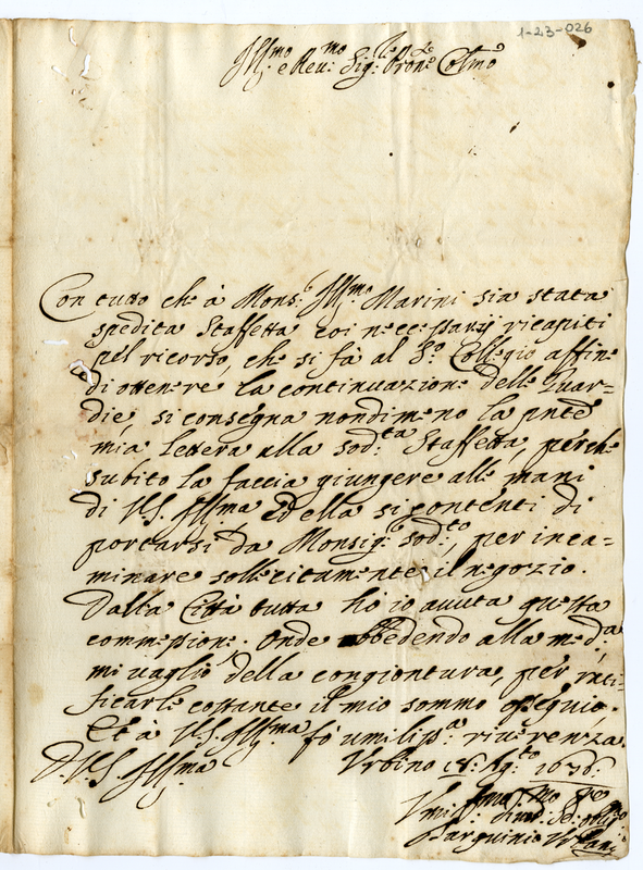 Lettera di Tarquinio Urbani a Giovanni Francesco Albani (1676 agosto 18)