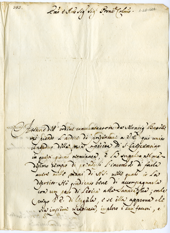 Lettera con la quale si presenta al cardinale il secondo volume su San Crescentino affinchè la consegni a Sua Santità. Al Cardinale chiede anche la continuazione del suo patrocinio