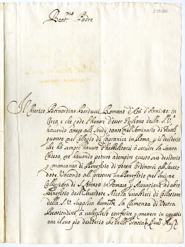 Lettera di Bernadino Berducci a papa Clemente XI (1700-1721)