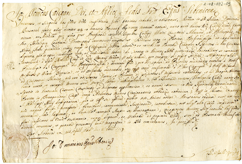 Attestato di idoneità morale ed intellettuale del sacerdote Domenico Bersatich redatto dal vescovo di Sebenico Giovanni Domenico Calegari.