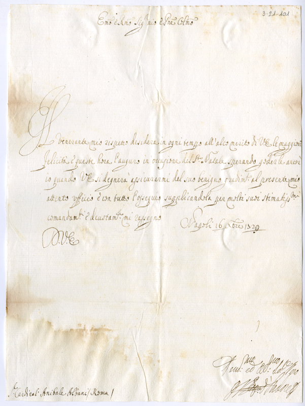 Lettera del principe di Ardore al cardinale Annibale Albani (1729 dicembre 16)