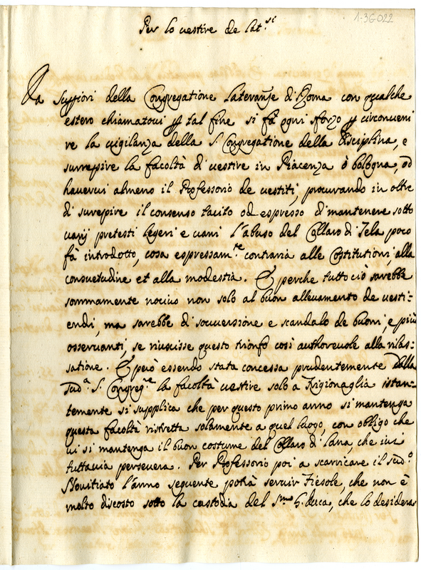 Sulla necessità di richiamare un adeguato vestire dei Canonici Lateranensi contro usi sovversivi e poco edificanti (1700-1721)