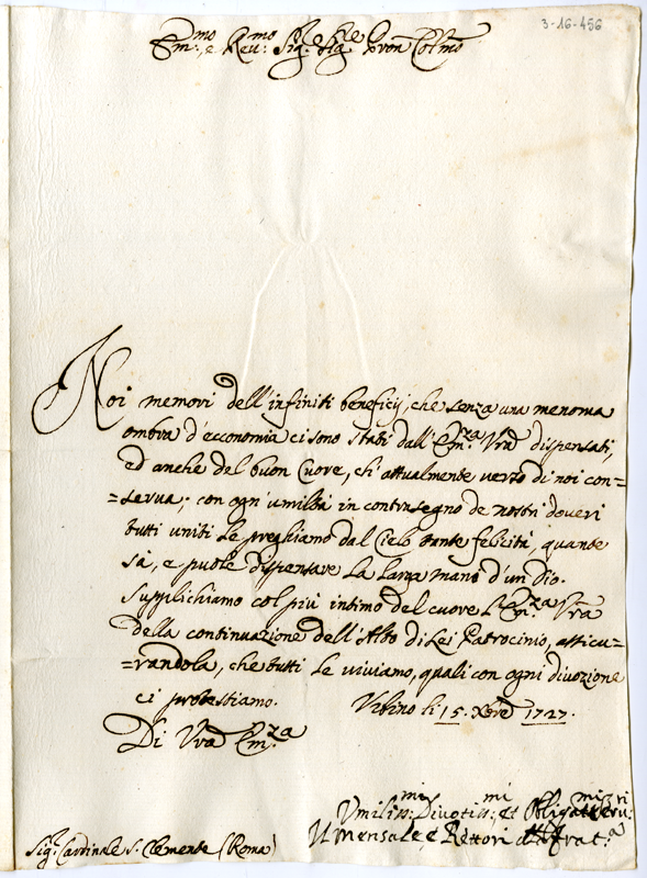 Lettera del mensale e rettori della fraternita di Urbino al cardinale Annibale Albani (1727 dicembre 15)