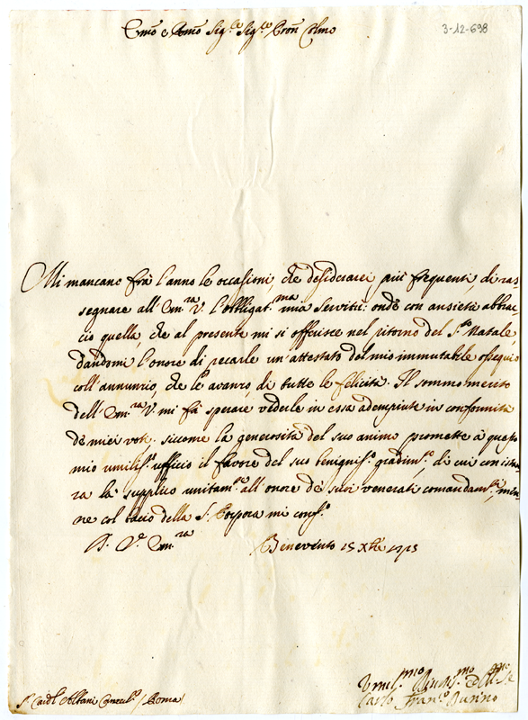 Lettera di Carlo Francesco Durino al cardinale Annibale Albani (1725 dicembre 15)