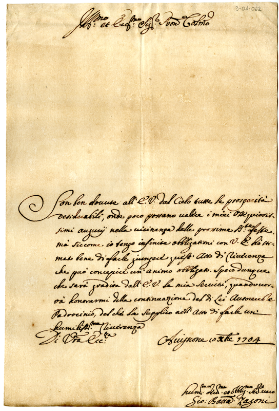 Lettera di Giovanni Battista Zagoni ad Annibale Albani (1704 dicembre 10)