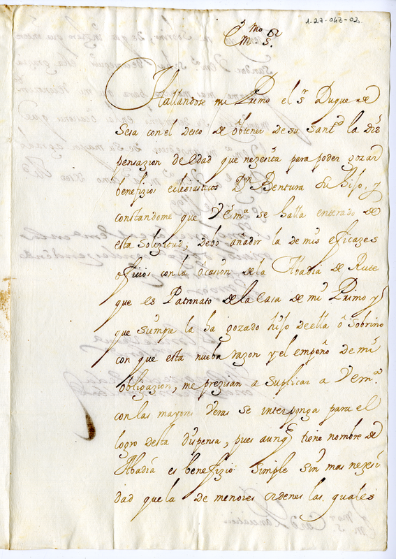 Richiesta di ottenere la dispensa per godere del beneficio ecclesiastico da parte di Don Ventura de Sifo