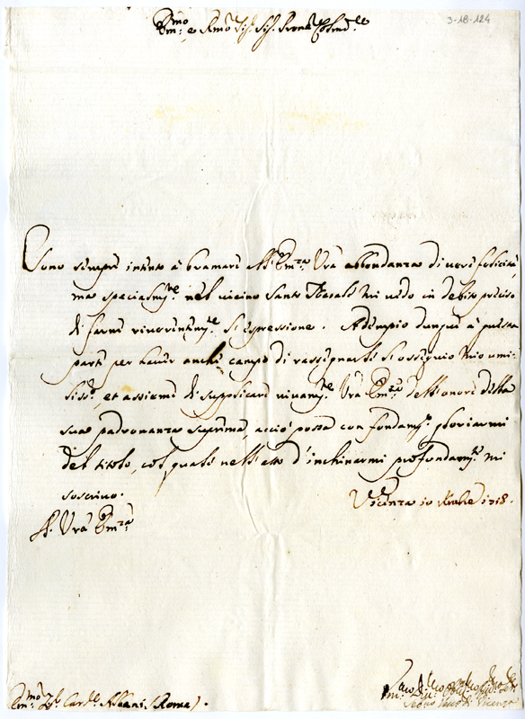 Lettera di Sebastiano vescovo di Vicenza al cardinale Annibale Albani (1718 dicembre 10)