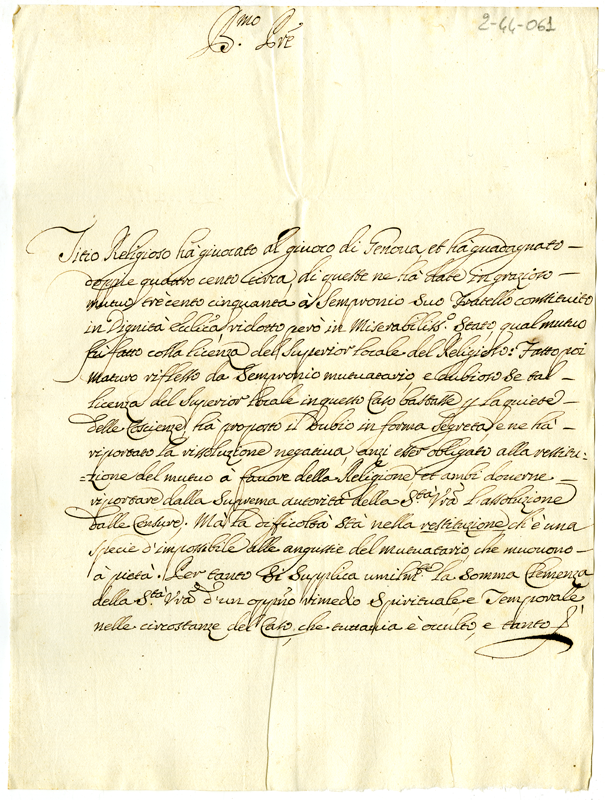 Supplica al pontefice Clemente XI per un opportuno rimedio spirituale e temporale relativo alla impossibilità di restituire una somma (1700-1721)