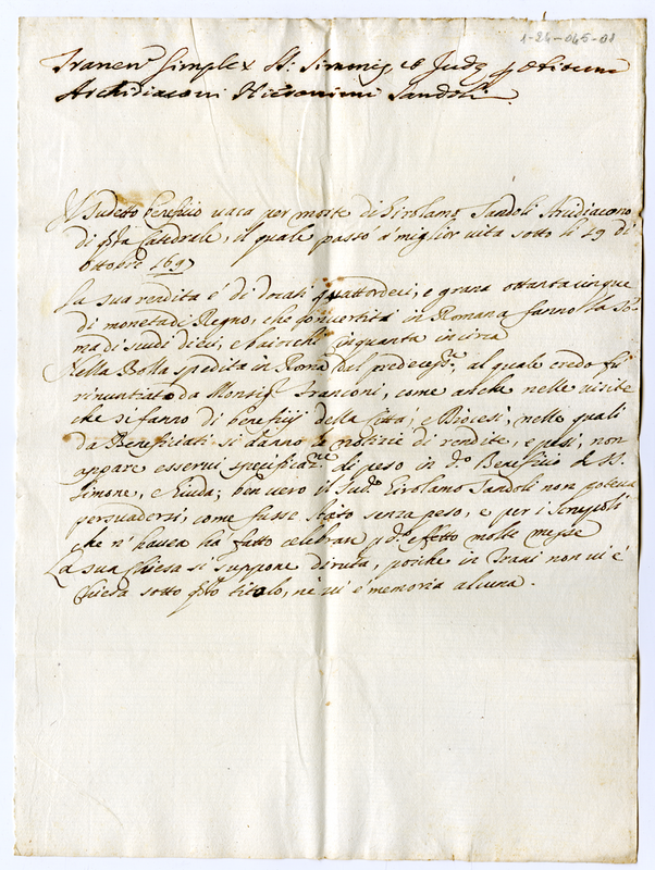 Rendita e pesi del beneficio semplice sotto il titolo dei Santi Simone e Giuda vacante per morte dell'arcidiacono Girolamo Sandoli