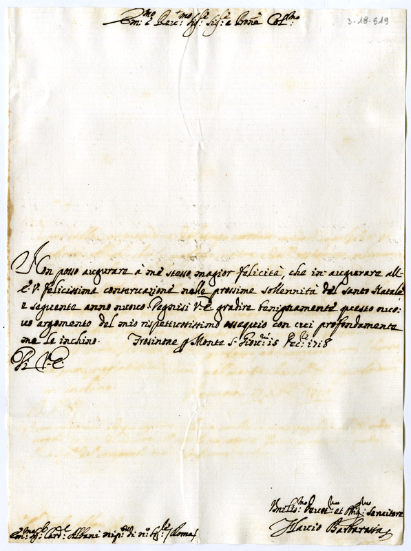 Lettera di Flavio Barbarossa al cardinale Annibale Albani (1718 dicembre 15)