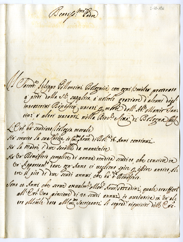 Lettera del sacerdote Filippo Pelloncini a papa Clemente XI (1700-1721)