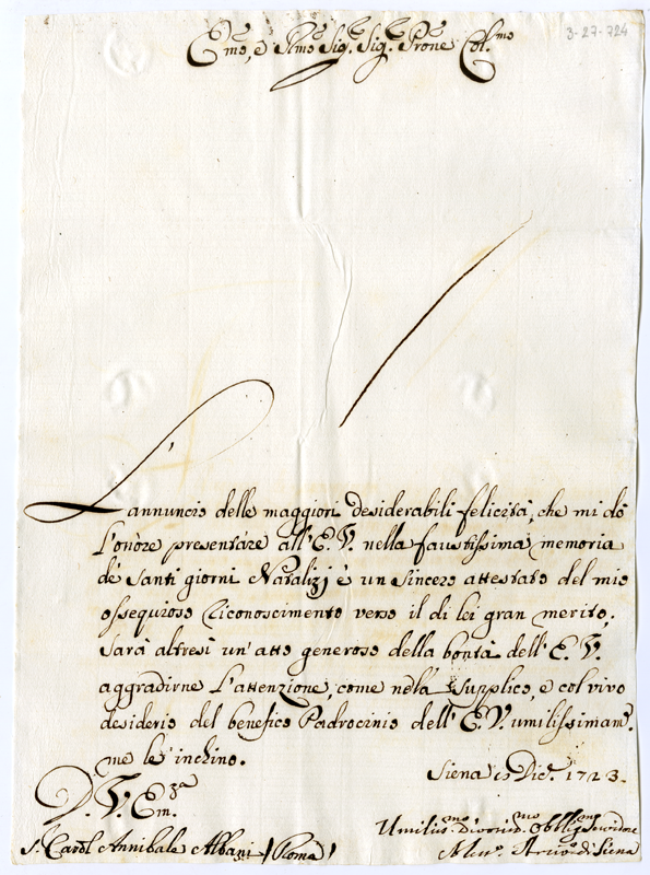 Lettera dell'arcivescovo di Siena al cardinale Annibale Albani (1723 dicembre 8)