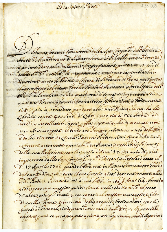 Lettera di d. Silvano Catanzi abate vollombrosano di San Bartolomeo di Ripoli presso Firenze a papa Clemente XI (1700-1721)