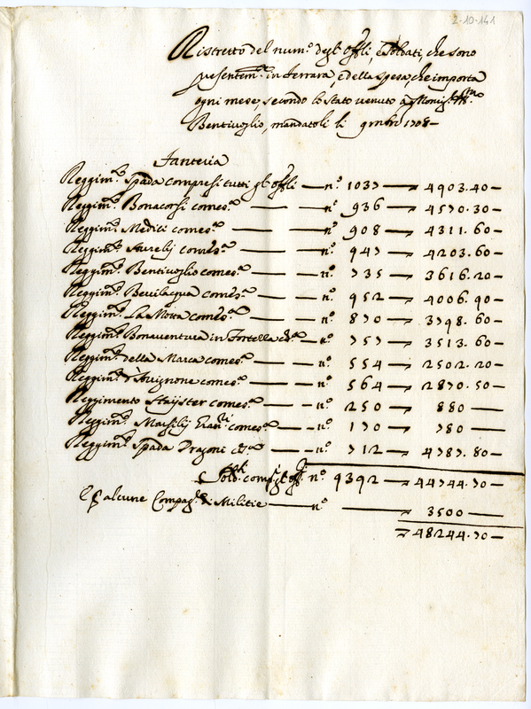Ristretto del numero degli Officiali, e Soldati, che sono presentemente in Ferrara, e della spesa, che importa ogni mese, secondo lo stato venuto a Monsignore Illustrissimo Bentivoglio, mandatoli li novembre 1708