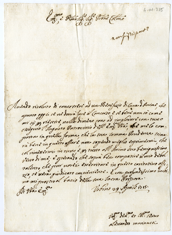 Lettera di Alessandro Marinucci al Cardinale Annibale Albani (1715 aprile 29)