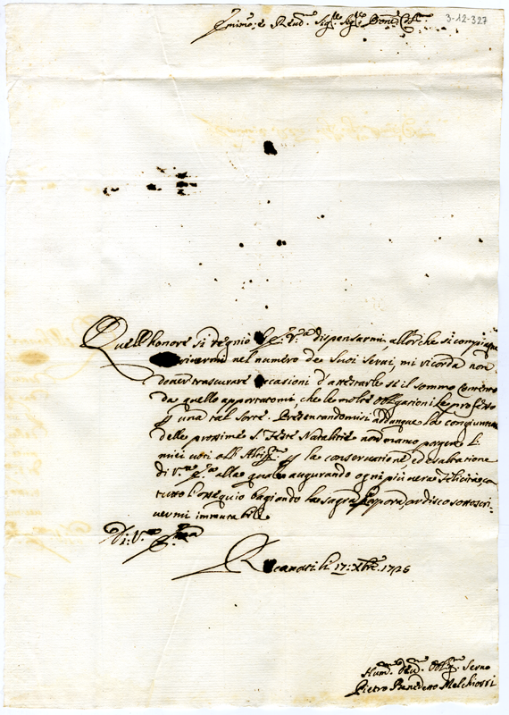 Lettera di Pietro Benedetto Melchiorri al cardinale Annibale Albani (1725 dicembre 17)