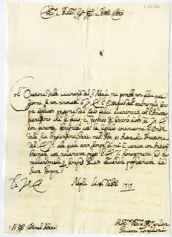 Lettera di Giovanni Toroglioni al cardinale Annibale Albani (1717 dicembre 14)