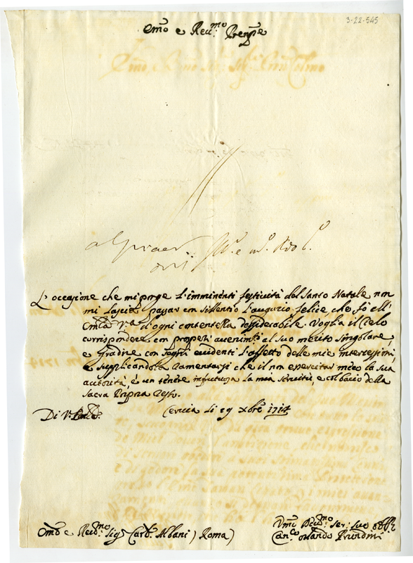 Lettera di Orlando Prundini al cardinale Annibale Albani (1714 dicembre 19)