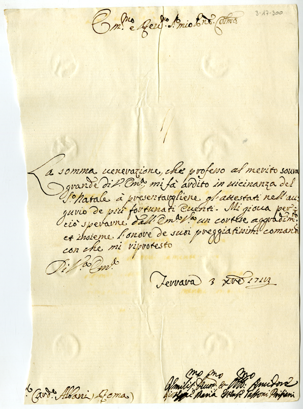 Lettera di Giuseppe Maria Estense Tassoni Prisciani al cardinale Annibale Albani (1718 dicembre 3)