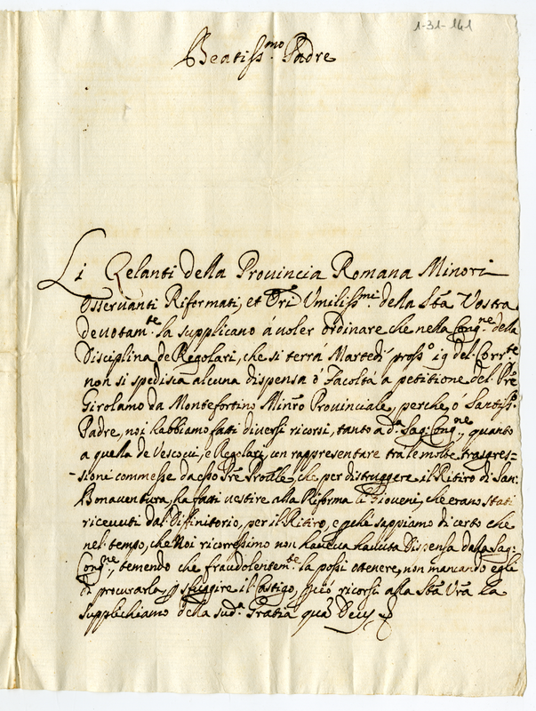 Lettera dei padri zelanti della provincia romana minori osservanti a papa Clemente XI (1700-1721)