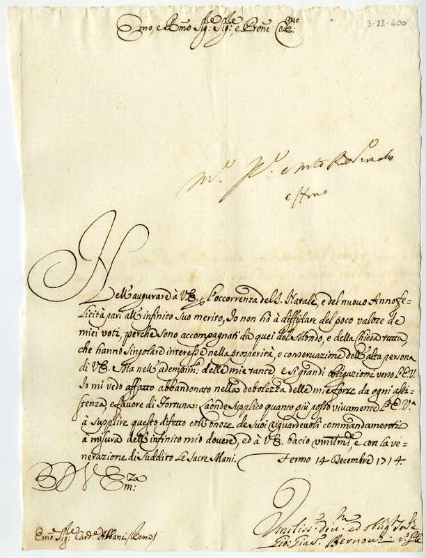 Lettera di Giovanni Giacomo Bernocchi al cardinale Annibale Albani (1714 dicembre 14)