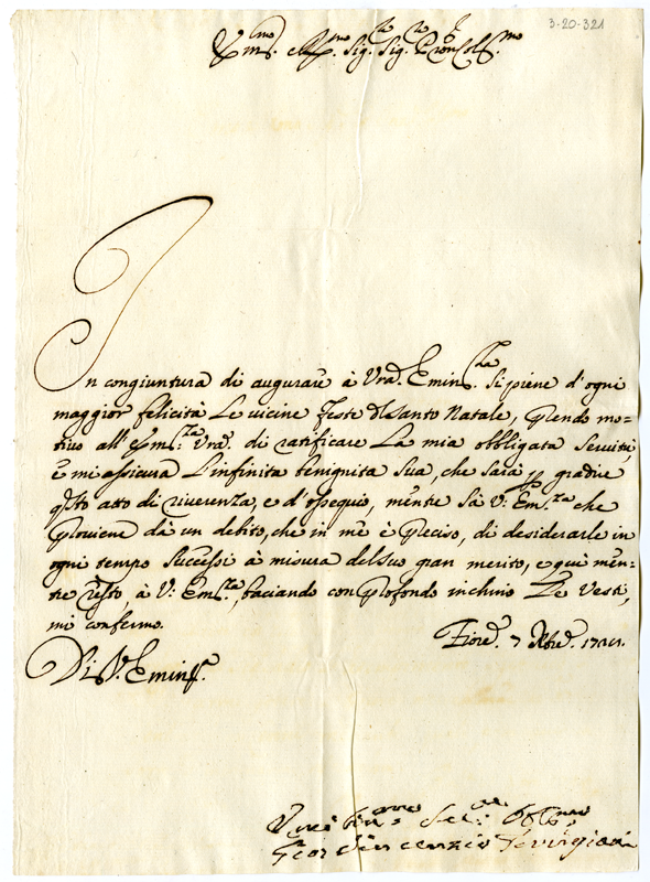 Lettera di Giovanni Vincenzo Torrigiani al cardinale Annibale Albani (1728 dicembre 7)