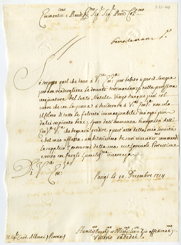 Lettera di Vittorio Ondedei al cardinale Annibale Albani (1714 dicembre 10)