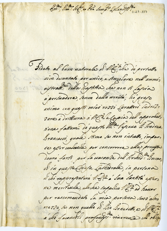 Lettera del Canonico don Francesco Ricci ad un Cardinale (1700 settembre 25)