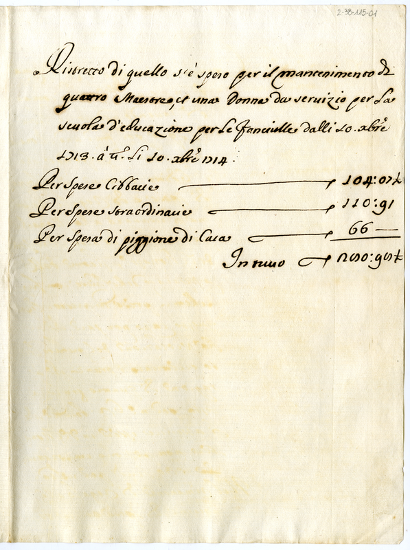 Ristretto di quello s'è speso per il mantenimento di quattro Maestre, et una donna da servizio per la scuola di educazione per le fanciulle dalli 10 dicembre 1713 a 10 dicembre 1714