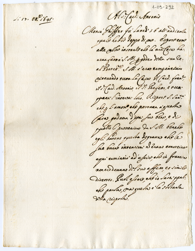 Minuta di lettera al cardinale Barberini Antonio (1645 ottobre 17)