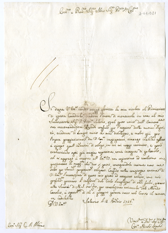 Lettera di Nicolò Lembo al Cardinale Annibale Albani (1716 gennaio 3)