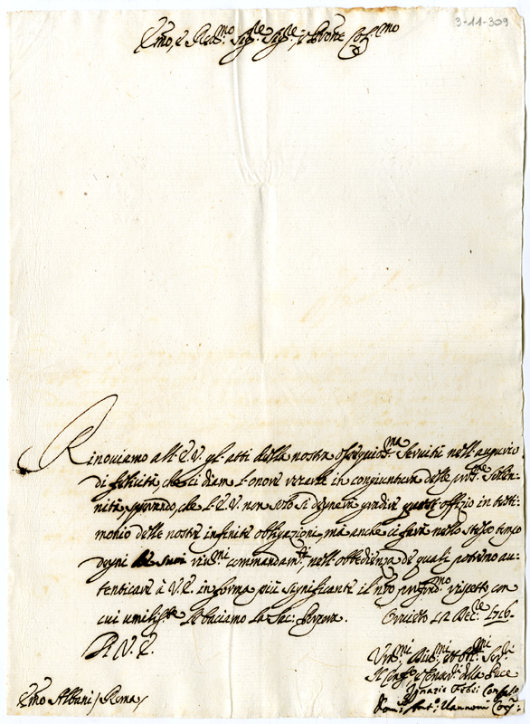 Lettera dei conservatori di Orvieto Ignazio Febei e Domenico Antonio Vannoni al cardinale Annibale Albani (1716 dicembre 12)