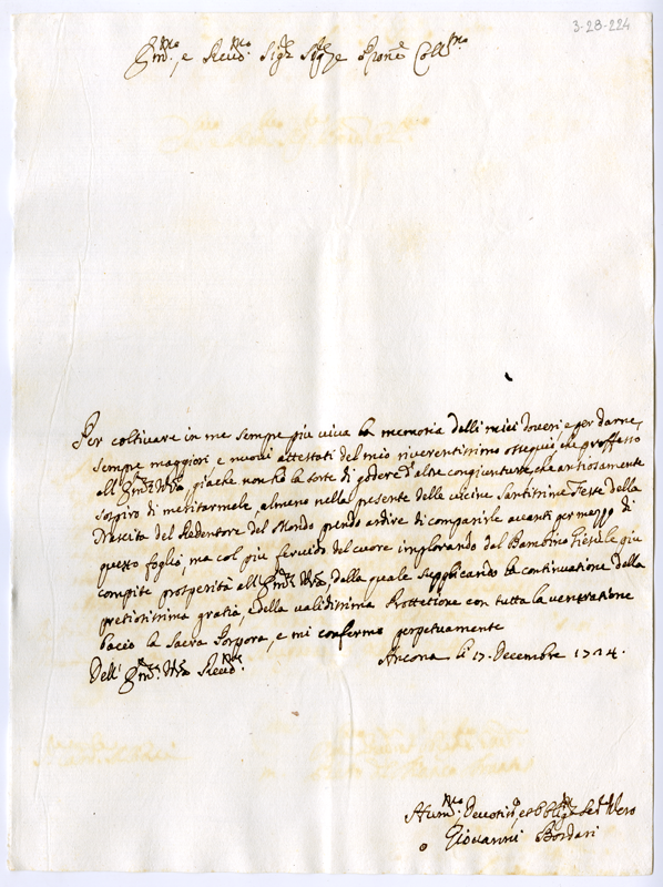 Lettera di Giovanni Bosdari al cardinale Annibale Albani (1724 dicembre 17)