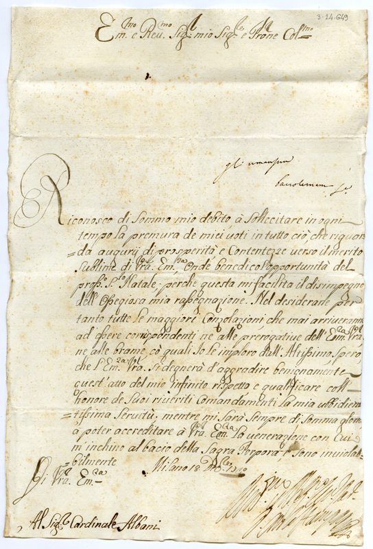 Lettera di don Stampa al cardinale Annibale Albani (1720 dicembre 18)