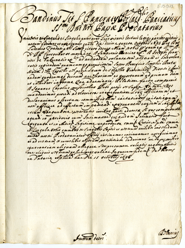 Bolla del cardinale Prodatario Bandino Panciatici sul conferimento di un beneficio (1698 ottobre 15)
