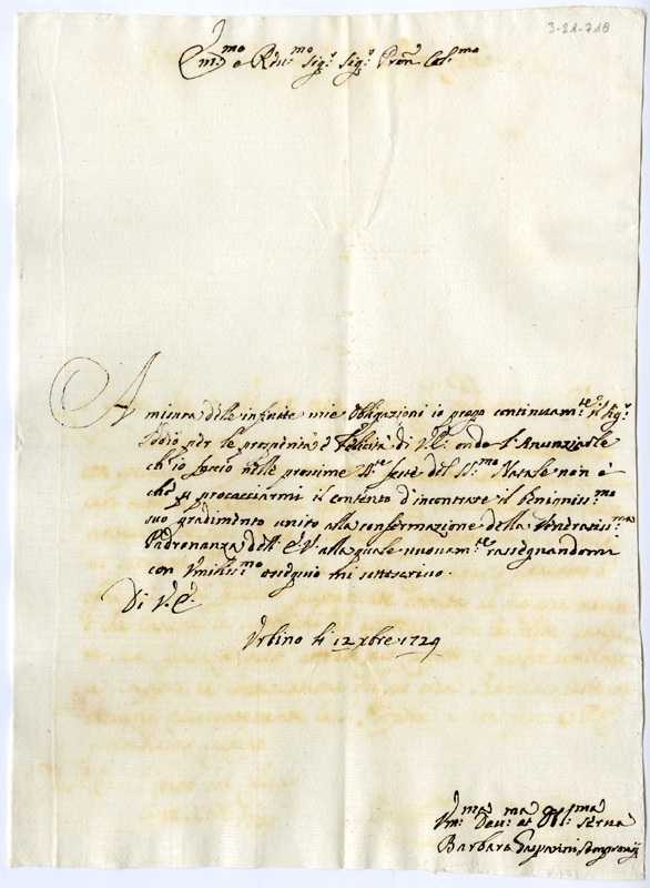 Lettera di Barbara Gasparini Sempronii al cardinale Annibale Albani (1729 dicembre 12)