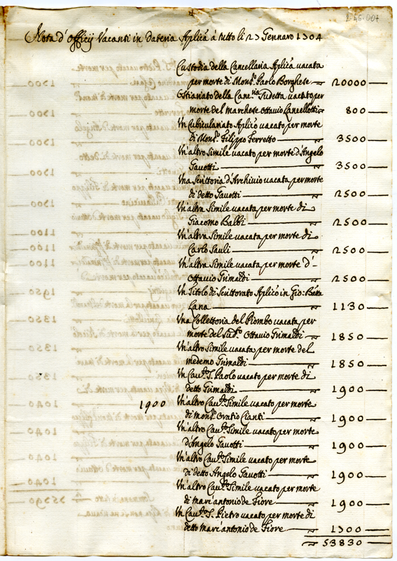 Nota d'Officii Vacanti in dateria Apostolica a tutto li 27 Gennaro 1704