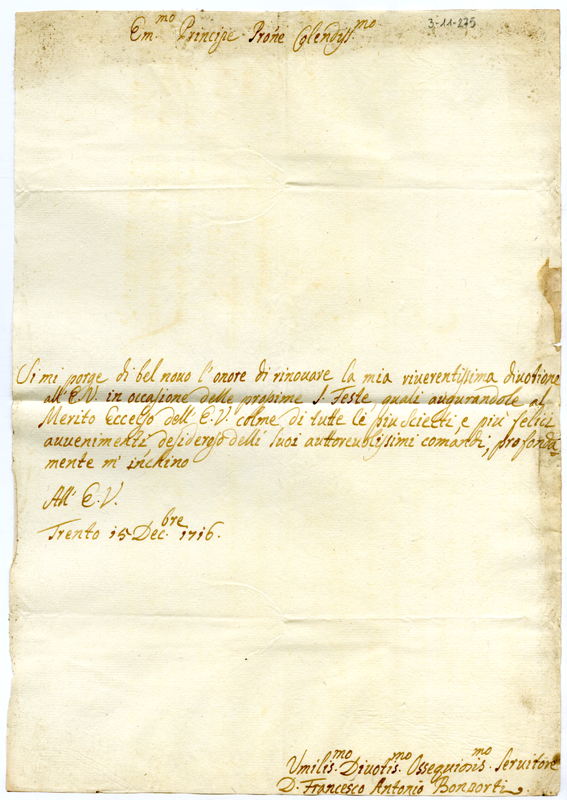 Lettera di don Francesco Antonio Bomporti al cardinale Annibale Albani (1716 dicembre 15)