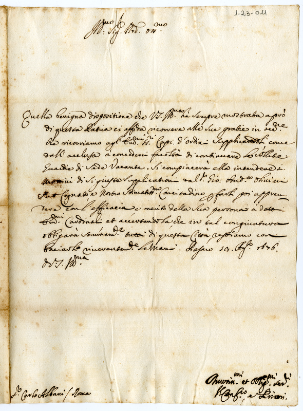 | dc.description | Chiedono a Carlo Albani di voler sostenere presso i Cardinali la supplica loro rivolta di "continuare le sollite Guardie di Sede Vacante" | |