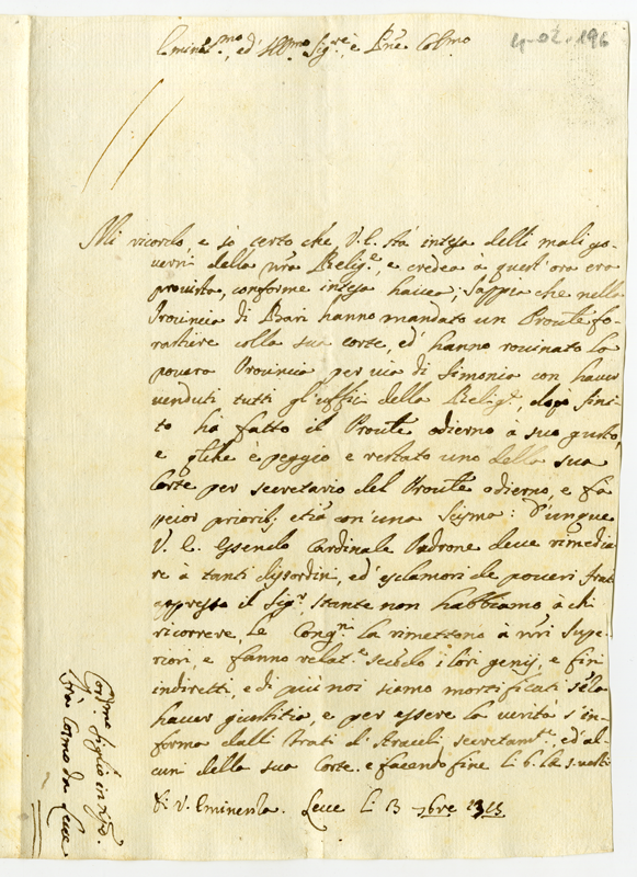 Lettera di fra Cosmo da Lecce al Cardinale Annibale Albani (1715 settembre 3)