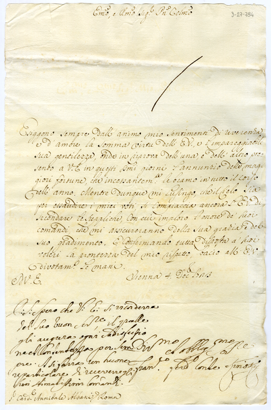 Lettera di Francesco Ferdinando conte Kinsky al cardinale Annibale Albani (1723 dicembre 4)