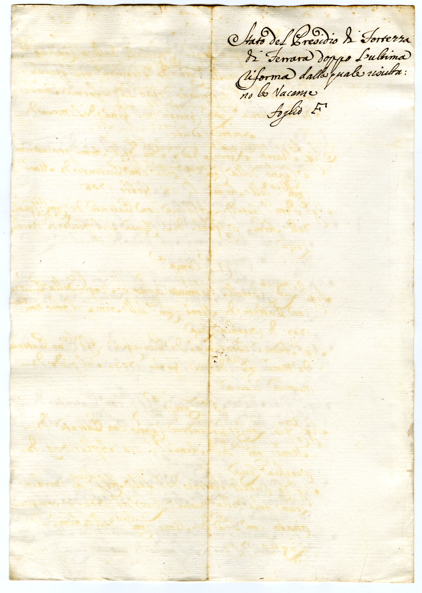 Stato del Presidio di Fortezza di Ferrara doppo l'ultima riforma dalla quale risultano le vacanze. Foglio F (1700-1721)