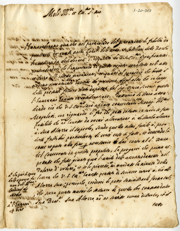 Si meraviglia che il giuramento prestato dai governatori delle armi e castellani delle rocche abbia bisogno di altri accomadamenti concertati con monsignor Magalotti. Prega l'Albani di risolvere prima la questione del palazzo di Urbino e di scrivere poi sulla questione in termini adatti allo stato d'animo del duca