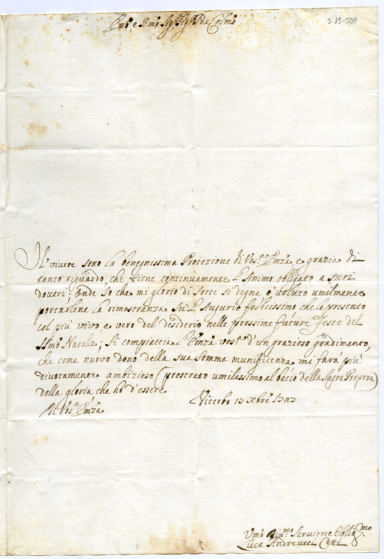 Lettera di Luca Andreucci Cetti al cardinale Annibale Albani (1727 dicembre 17)