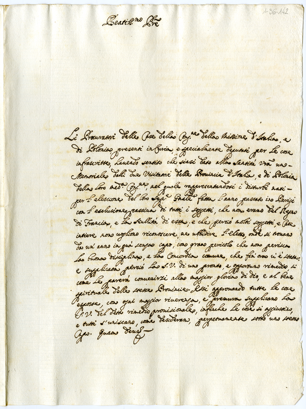 Lettera dei Pocuratori delle Case d'Italia e di Polonia della Congregazione della Missione a papa Innocenzo XII (1698 agosto 18)