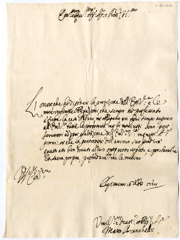 Lettera di Mario Bianchelli al cardinale Annibale Albani (1728 dicembre 6)
